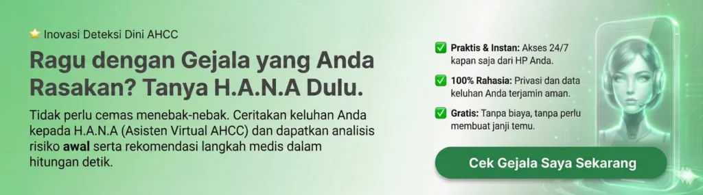 HANA adalah asisten digital dari Adi Husada Cancer Center (AHCC) yang membantu mendengarkan keluhan Anda secara privat, melakukan anamnesis awal, dan memberi panduan awal tentang langkah medis yang tepat.