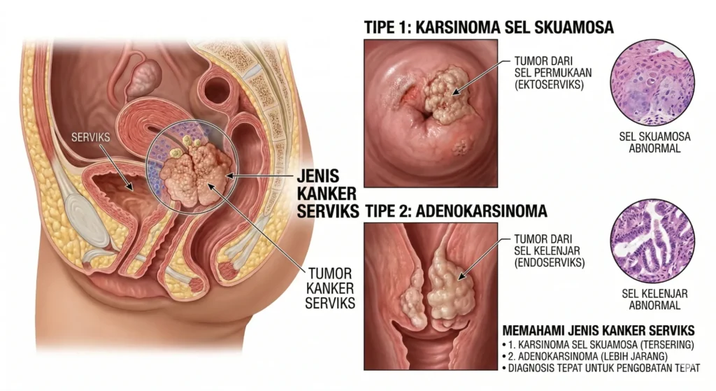 - Adenokarsinoma, kanker pertama kali muncul pada sel glandular (kelenjar) yang ada di dinding saluran serviks.