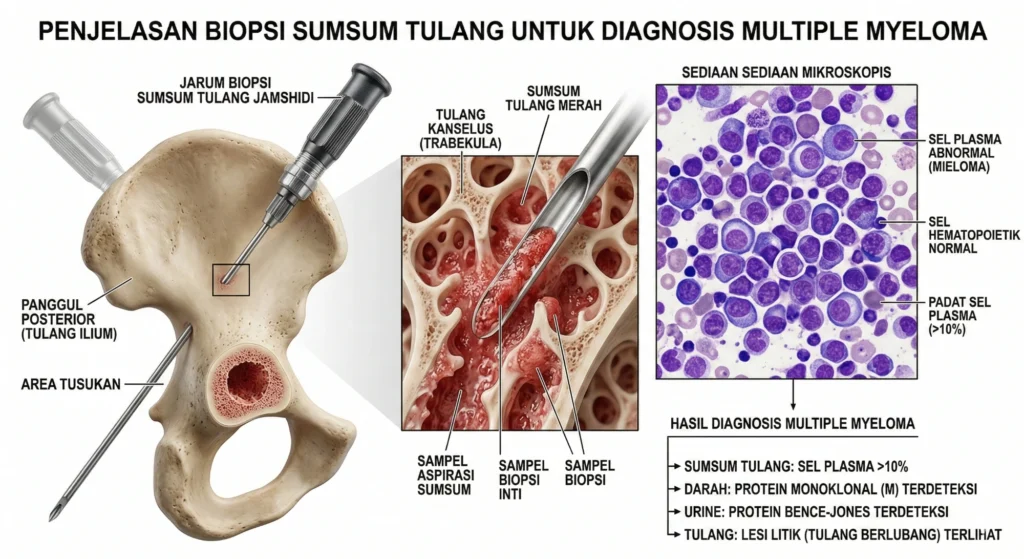 | Biopsi sumsum tulang | Sampel sumsum tulang | Jumlah dan sifat sel plasma abnormal | Kunci konfirmasi diagnosis |